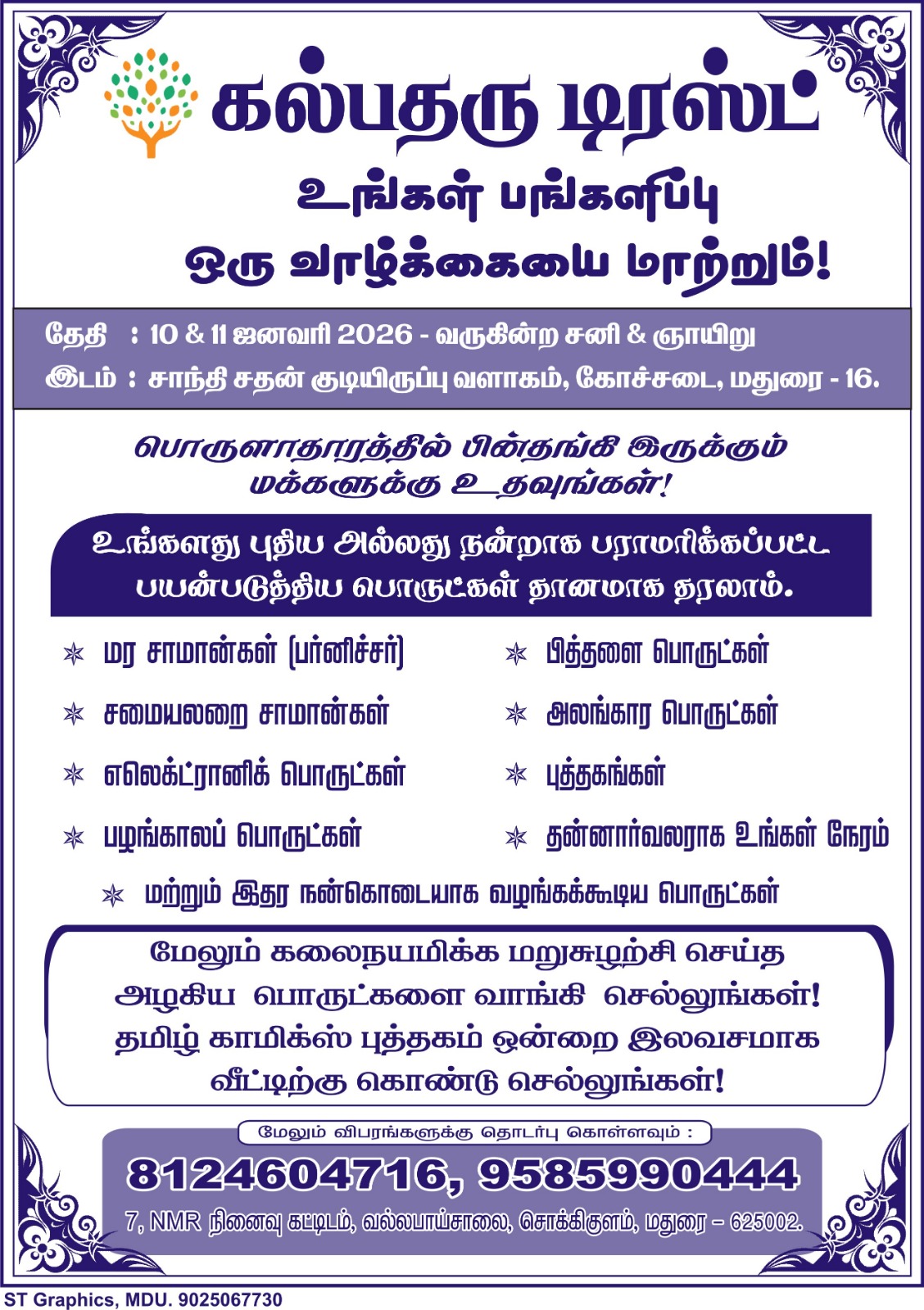 கல்பதரு டிரஸ்ட் வணக்கம்🙏🏻 உங்கள் பங்களிப்பு ஒரு வாழ்க்கையை மாற்றும்! உங்களது புதிய மற்றும் பயன்படுத்திய பொருட்கள் தானமாக தரலாம்.. தேதி: 10 & 11 ஜனவரி 2026, வருகின்ற சனி & ஞாயிறு. இடம்: சாந்தி சதன் குடியிருப்பு வளாகம், கோச்சடை, மதுரை-16 தொடர்புக்கு : 8124604716 / 9585990444